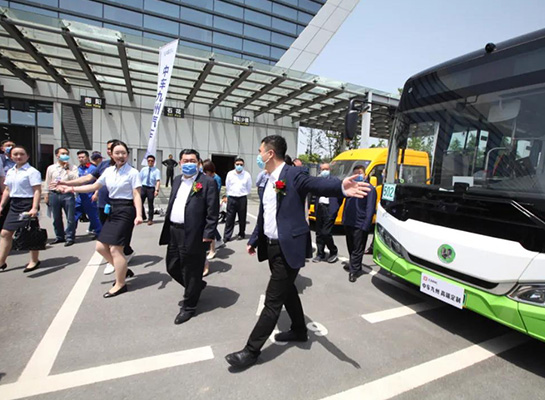 襄陽市政府黨組成員李德璋(右二)觀看九州城市客車